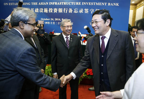 中国财政部部长楼继伟在致辞中表示,备忘录签署是亚投行创建过程中具有里程碑意义的重要时刻,标志着亚投行筹建工作即将进入新阶段。