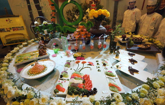 10月24日,在南京举办的“2014江苏国际餐饮博览会”上,参加厨艺技能竞赛的精美菜肴吸引了观众们的目光。据悉,本届餐博会以“大众餐饮·绿色消费”为主题,开展了烹饪大赛等一系列的活动展示舌尖上的美食。