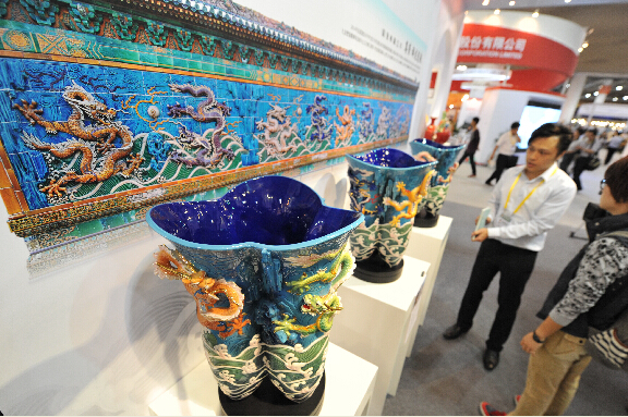 参观者在文博会上参观以北京故宫九龙壁为灵感设计的《尊荣 祥龙瓷瓶》