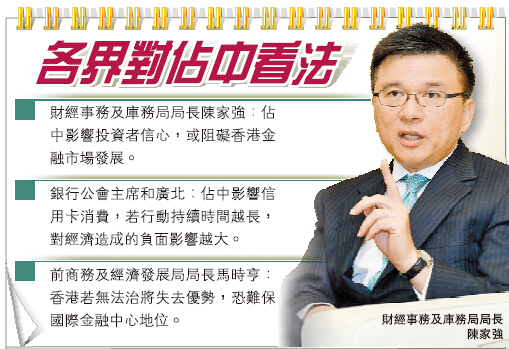 【香港商報訊】記者黃稀尔、朱樂恩報道:佔中風波未平,影響持續發酵。財經事務及庫務局局長陳家強指,香港金融市場很注重投資者信心,而投資者信心建立於香港的金融市場及經濟是否穩定。他憂慮,佔中或給香港金融市場發展帶來負面影響並有損投資者信心,冀參與佔中的人士能思考其行動後果。銀公主席和廣北亦希望佔中能盡快結束,因為佔中時間拖得越長,對經濟影響越大,目前已對銀行信用卡業務造成打擊。