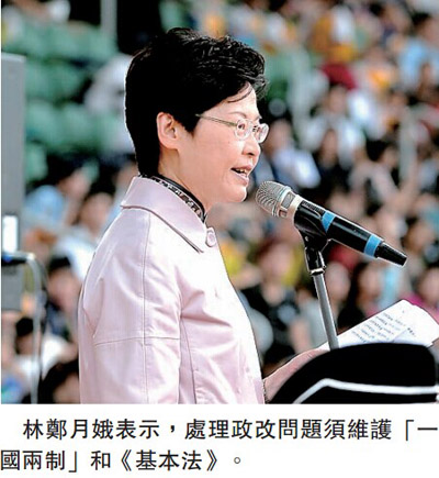 林鄭強調,政改不是簡單的事,亦並非香港單方面可處理的事,政府會堅持「一國兩制」原則,維護《基本法》,亦會維護法治;她批評有佔領者漠視高等法院頒布的禁制令,對本港法治構成很大衝擊。