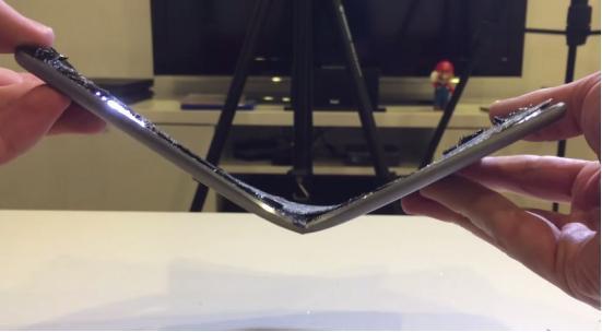 從這段視頻中可以看出,該機確實能夠被掰彎,但測試者卻費了不小力氣。不過,普通用戶在日常使用iPad Air 2時基本不會遭遇意外。而iPhone 6 Plus作為手機裝在褲子口袋中的幾率較高,掰彎這一狀況發生的可能性也就較大。