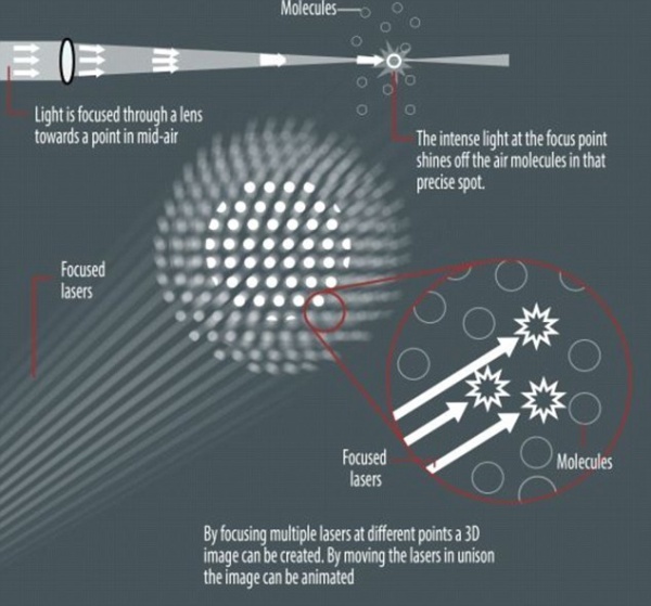 與放大鏡把陽光聚焦於一點的方法一樣,該裝置把強激光聚集到空中的一小點。這導致那裏的分子發射出白光,看起來就像是一次微型爆炸和一個明亮的LED的結合體。研究人員說:“我們這項技術的最大特點,就是我們能把光集中於一點,讓它在任何我們中意的地方發光。”