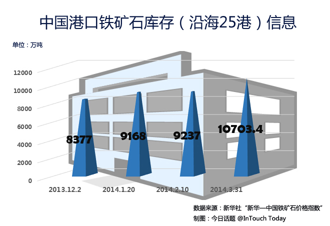 從去年11月到今年3月,中國港口庫存鐵礦石激增