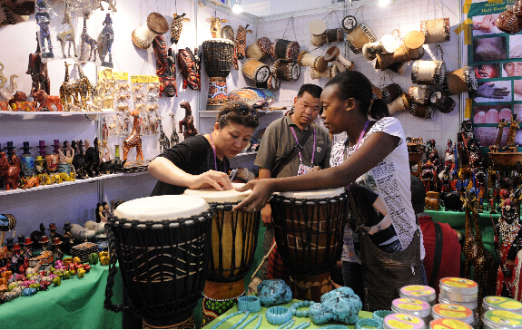 在廣交會三期進口展區,一位來自肯尼亞的參展商(右)在向客人推薦非洲的產品