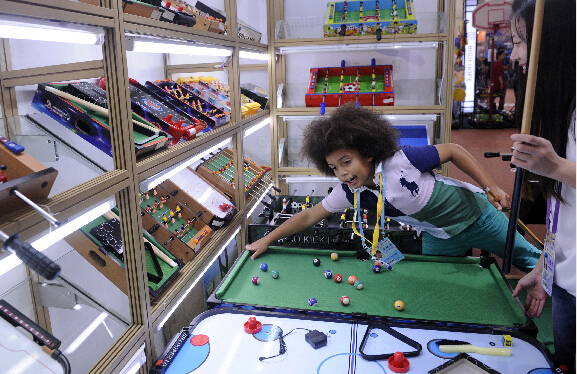 廣交會上的“采購商二代”、來自法國的8歲米森在廣交會三期上體驗一款迷你臺球