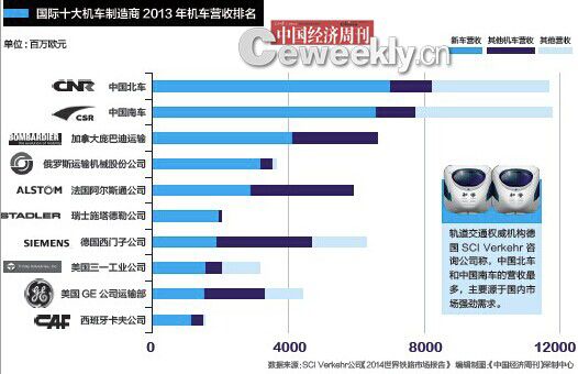2013年年報數據顯示,截至2013年末,中國北車實現營業收入972.4億元,中國南車則為978.9億元,接近這兩家公司剛成立時收入的10倍。