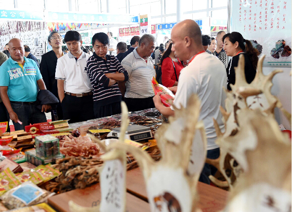 參觀者在邊境經濟貿易交易會上參觀中藥展銷