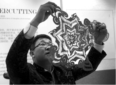 剪紙藝術家王磊審視自己的作品。昨天,APEC主要會場之一,國家會議中心的裝飾布置充滿“京味兒”。新華社發