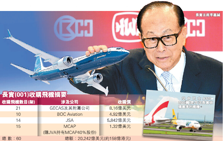 據長實發出的通告指,收購的飛機型號包括空中巴士A320-200、A330-300、A319-100、A321-200、波音777-300ER、737-700、737-800,以及737-900ER等。這些飛機平均年齡為1.8至4.4年不等,目前正出租給各不同航空公司,平均餘下租賃期約6至9年。今次收購涉及約158億港元。