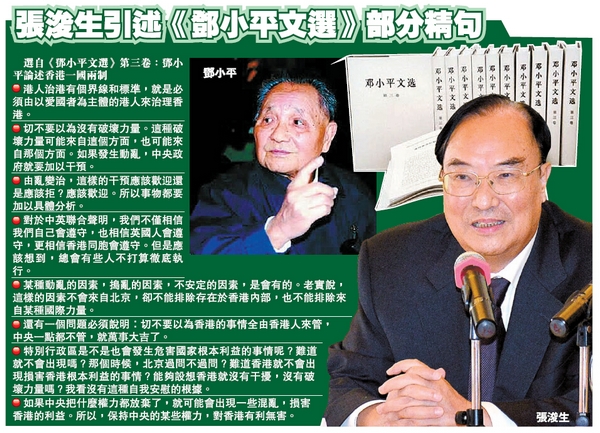 不過,他亦強調,鄧小平曾提到的觀點,香港有可能面對來自內外的搗亂和破壞、香港不能亂,亂就需要干預,因此必須保持中央對香港的權力(主要內容見附表)。張浚生明言,自己當年就將鄧小平關於香港的指示牢記在心,這些指示到現在依然適用。