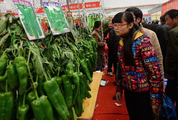 參觀者在農高會上參觀選購青椒