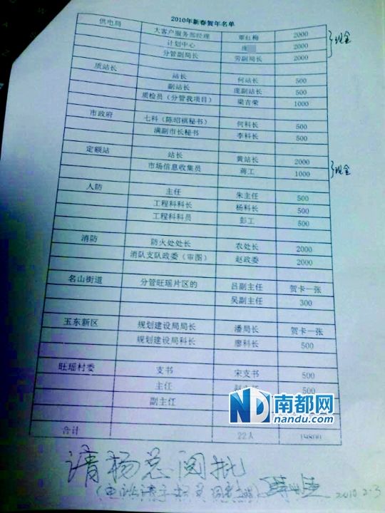 該明細表還顯示,2008年9月9日,公司曾付楊總諮詢費(玉林經開區党工委盧姓領導)10萬元,上面有該開發商現任董事長楊某的簽名。而在另一份“2010年新春賀年名單”中,則詳細記錄著給玉林市供電局、市政府、消防支隊等單位負責人的禮金。其中金額最大為2000元,最少為500元,累計22人共19800元。