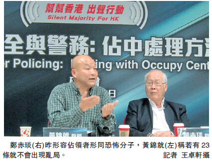 「幫港出聲」昨日舉辦「公共安全與警務:佔中處理手法」研討會。擔任主持人的鄭赤琰表示,香港警察未有政治訓練的背景,亦未能掌握情報,面對「佔中」這種大型運動,不知如何行動。研討會講者黃錦就認同鄭的說法,認為特區政府可考慮成立「本土保衛局」,專門負責處理本港的危機及接收情報。