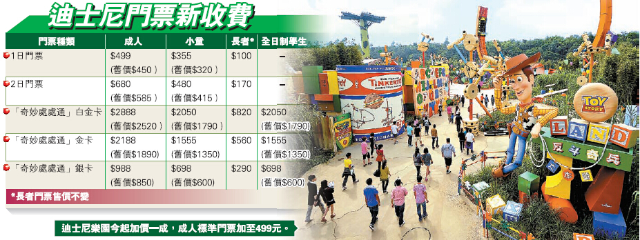 開業8年的香港迪士尼樂園昨宣布,今日起加價約一成,成人一日門票新售價為499元,小童門票為355元,兩日門票為680元,兩日小童門票為480元;至於年票「奇妙處處通」價錢亦會調整,成人銀卡由850元加至988元,金卡和白金卡的新售價分別為2188元和2888元。