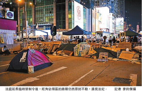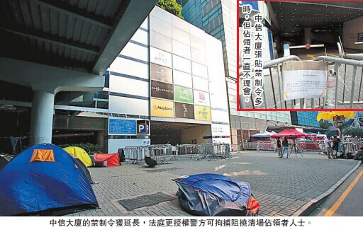 【香港商報訊】早前運輸業界及金鐘中信大廈業主向法院申請臨時禁制令,要求佔領旺角及佔領金鐘地區「清場」。高院法官昨正式下令延續佔旺及佔鐘臨時禁制令,表明若有佔領人士阻攔執達吏「清場」,警方可採取拘捕,而被捕人士亦應被盡快帶上法庭。法官稱佔領人士公然違反禁制令,是對司法公義及法庭威信構成「真正危機」,嚴重削弱香港法治。