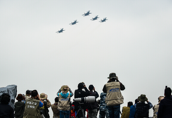 一群飛友、軍迷在珠海三灶機場航展中心外的“炮樓”上拍攝俄羅斯勇士飛行隊的SU-27戰機