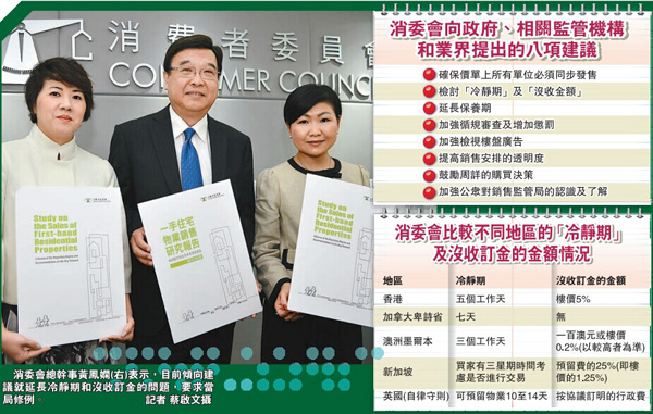 【香港商報訊】記者劉思桐報道:一手新例迄今已實施約一年半,消委會昨發布研究報告指,現時的法例尚不是「萬靈丹」,監管力度不足以杜絕損害消費者權益的銷售手法,如「唧牙膏」式推售單位以營造氣氛、售樓現場地產代理催迫準買家迅速購置單位等老問題,依舊在市場存在。消委會總幹事黃鳳嫻表示,消委會已向政府、相關監管機構和業界提出八項建議,包括確保價單上所有單位必須同步發售、檢討「冷靜期」及「沒收金額」等。