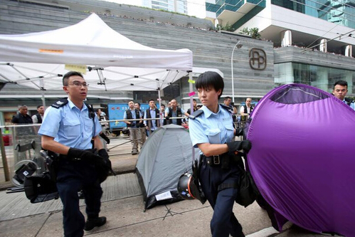 近日,占領者仍然占據金鐘、旺角和銅鑼灣三個地區的部分道路。據《環球時報》記者11日現場所見,在占領區大本營金鐘,約有六七百個帳篷,但很多帳篷已沒有人留守。在旺角,只有二三十個帳篷,占領人數約有100人。銅鑼灣更少,只剩十幾名占領者。