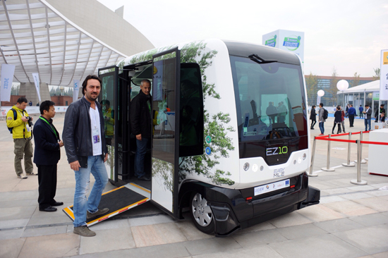 11月12日,參觀者在活動現場觀看一款無人駕駛車。