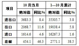 10月當月,我國進出口總值3683.3億美元,增長8.4%。其中出口2068.7億美元,增長11.6%;進口1614.6億美元,增長4.6%;貿易順差454.1億美元,增長46.3%。