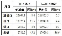 10月當月,我國進出口總值22664.3億元,增長8.4%。其中出口12725.4億元,增長11.5%;進口9938.9億元,增長4.6%;貿易順差2786.5億元,增長45.2%。