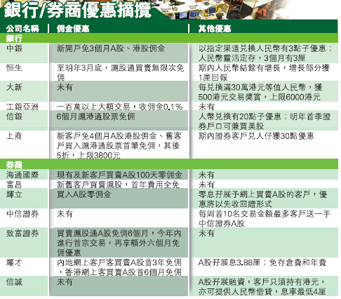 講到最具噱頭的優惠,中信證券是一例。該行推出每周首10名轉倉或買入A股金額最高的客戶,可免費獲贈一手中信證券A股。另外,恒生(011)的無限次買賣滬股免佣,同樣進取,惟明年3月底截止。