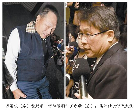 綠島監獄典獄長蘇清俊、台中監獄副典獄長趙崇智,因涉嫌收受多名收容人家屬賄賂近百萬元(新臺幣,下同),協助收容人夾帶違禁品並放寬會客許可權,昨日被檢方約談後申請羈押。臺北、台中、綠島三大監獄因此遭大規模搜索,創下島內獄政史貪污紀錄。蘇清俊受賄百萬甘當獄中富豪“傳令兵”
