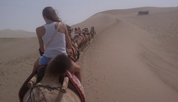 我第一次假扮美國小姐是在9月份。那時主辦方在敦煌的綠洲中舉辦“國際葡萄節”。他們邀請了40名模特,包括我,在T臺上為2000多名當地觀眾表演。這簡直太假了!之后,我們又騎在駱駝背上,排成一隊,穿過戈壁中的沙丘。從當時拍的照片上可以看出,我們40個人騎在駱駝背上,有的人甚至只穿了胸罩,這真是太荒唐了!”