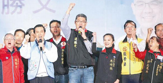 國民黨主席馬英九(前排左二)16日出席北市團結勝選大會,為國民黨臺北市長候選人連勝文(前排左三)站臺拉票。