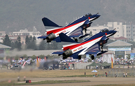 在本屆航展上,中國空軍“八一”飛行表演隊、俄羅斯空軍“勇士”飛行表演隊和阿聯酋空軍“騎士”飛行表演隊三支頂尖軍機飛行表演隊齊聚珠海同台獻藝。中國空軍“八一”飛行表演隊女飛行員首次駕駛殲-10亮相,盡顯巾幗風采;作為全球唯一一支使用重型戰鬥機進行表演的隊伍,俄羅斯空軍“勇士”特技飛行表演隊在本屆航展上採用蘇-27UB型戰鬥機獻上了“涅斯捷羅夫筋斗”、“加力盤旋”、“躍升半滾倒轉”、“對頭跌升急降”等驚險絕倫的特技表演;阿聯酋空軍“騎士”飛行表演隊表演了快速穿梭等驚險動作和漫天飛舞的四色彩煙等“招牌動作”,帶給現場觀眾驚心動魄而又充滿美感的視覺享受。