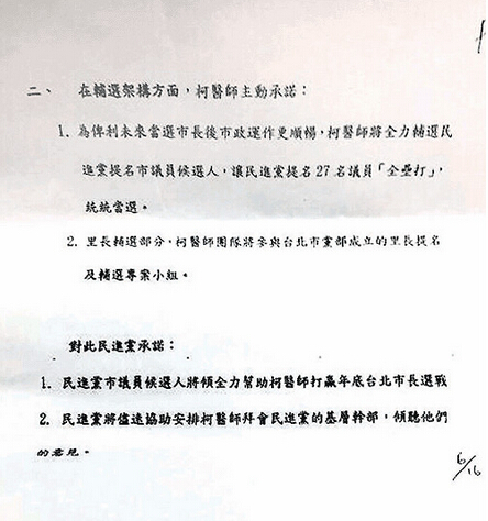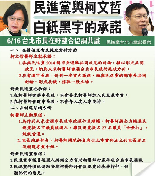 民進黨6月16日發出新聞稿,指柯文哲與北市整合協調小組協調后,分別在“價值理念及施政方針”、“輔選架構”兩方面,雙方共達成八項承諾。