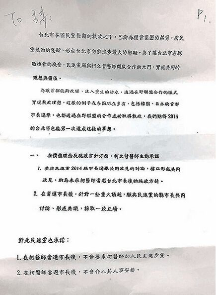 昨柯文哲記者會后,媒體追問和民進黨到底有無簽契約?內容為何?柯文哲說,“沒有啦,用字應該是當時的口頭協議啦!”當時是口頭協議,不過他這個人一向很講究誠信。