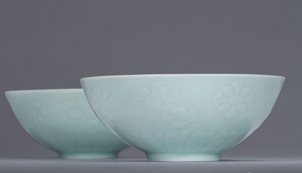 粉青釉淺浮雕刻纏枝蓮紋碗一對 清 雍正