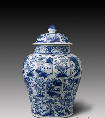由北京首博文化發展有限公司提供的青花將軍蓋罐,鈕蓋、直口、豐肩、弧腹、蓋上開光繪有花草圖案,腹部開光繪有四季花卉及山水圖案,造型莊重,胎體厚重,釉面光潔,青花發色鮮豔純正,為康熙年間將軍罐的精品,成對更為少見。
