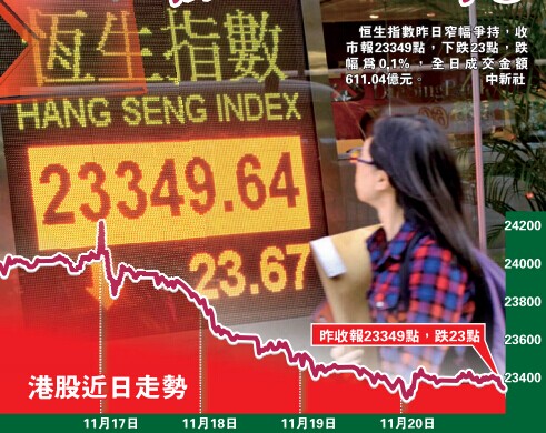 【香港商報訊】記者陳薇報道:「滬港通」通車第四日,使用額度進一步縮減,加上匯豐公布中國制造業采購經理指數(PMI)初值跌至50的盛衰分界線邊緣,是半年以來最低,差過市場預期,影響投資氣氛,港股昨日反覆偏軟,跌23點或0.1%,收報23349點,成交縮減至611億元。國企指數收10379點,跌1點或0.01%。港交所(388)行政總裁李小加預警,「滬港通」將轉淡靜。