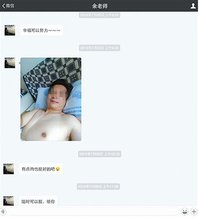 王靜向北青報記者出示的通訊記錄顯示,名為“余老師”的人將一些私照發送給她,其中還有王靜的私照。在聊天記錄中,“余老師”稱王靜為“老婆”。