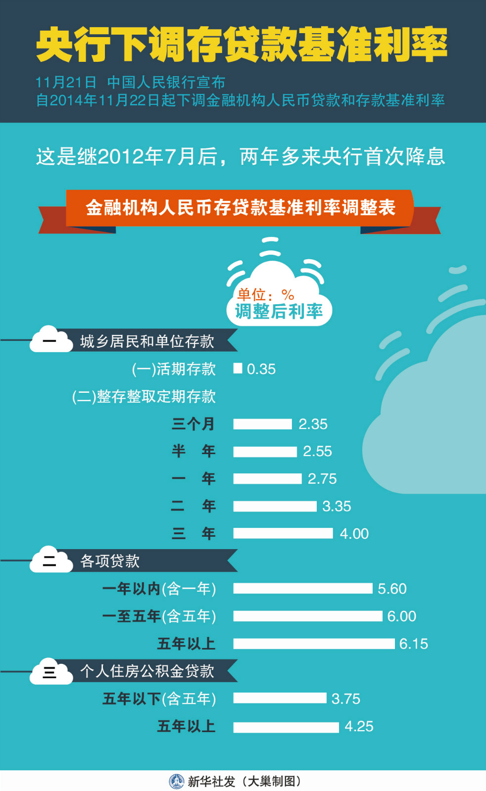 人民銀行昨日傍晚宣布,自11月22日起下調金融機構人民幣貸款和存款基準利率,一年期貸款基準利率下調0.4個百分點至5.6%;一年期存款基準利率下調0.25個百分點至2.75%。同時結合推進利率市場化改革,將金融機構存款利率浮動區間的上限由存款基準利率的1.1倍調整為1.2倍。