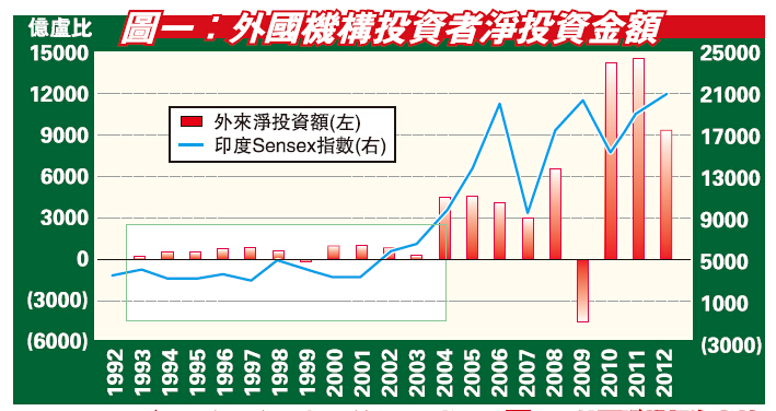 話說回來,自周一見到滬股通的投資氣氛比港股通熱烈后,大家都覺得內地資本市場發展將會因而踏前一大步,內地經濟及股市亦從此重回正軌。事實上,以印度為例,圖一可見,自1992年開放國外機構投資者參與股市至今,在印的凈投資額確是持續上升,金融海嘯后更升至開放后高位約15000億盧比,與2007年前只約5000億至6000億不能同日而語,更不能與1990年代只有數百億相比,似乎反映了改革開放真的能夠讓股市長空萬里。