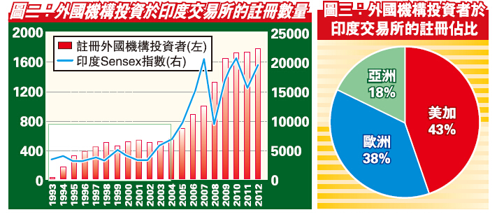 然而再看看,圖一見到,除了1992年起只要數百億的資金凈流入外,2004年后才突然升至每年數千億。何解外資要等數十年才加倍在印的投資?與印度股市比較一下,1992至2003年間,印度Sensex指數大概只算上落市,當時每年凈流入額亦只有數百億盧比。而當2004年環球經濟起動及金磚四國之名愈炒愈烈,印度股市亦開始爆升,資金凈流入與圖二的在印註冊外國投資機構才同時向上,類似情況亦發生在金融海嘯后。以此看,外資在印的投資興趣似乎與市場氣氛有直接關系。市好,投資氣氛上升并吸引外資流入;市差,外資對投資於當地市場亦打了折扣。
