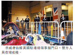 至昨日凌晨時分,有人在英國領事館門外放置數個帳幕及睡袋「徳街」,警方派出30多名警員到場架起鐵馬,分隔領事館範圍及示威者,有人揚言要把該處成為第4個占領區,又希望英國國會議員稍后來港時接收請願信,如果訴求未獲回應,他們不會離開。