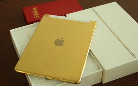 越南一家珠寶商已經給出了iPad Air 2的定制方案,其背殼材質換上了24K純金的,整機看起來土豪氣息十足,這款64GB的售價1315美元,折合人民幣約8100元。
