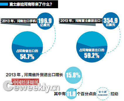 鄭州海關的資料顯示,2013年,富士康出口手機196.9億美元,增長26.4%,占河南省出口的54.7%。同期,富士康集團下轄企業進出口354.9億美元,增長20.7%,占該省進出口的59.2%,其中進口154.2億美元,占該省進口的64.4%;出口200.7億美元,占全省出口的55.8%。富士康進出口貿易對該省外貿的貢獻率為74.2%。2013年,該省外貿進出口增長15.8%,其中有11.8個百分點由富士康拉動。