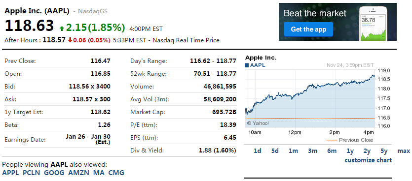 鳳凰科技訊 北京時間11月25日消息,據科技博客9to5mac報導,蘋果股價週一上漲1.85%,報收于118.63美元,再次創下歷史新高(1:7拆股後),市值達到6957億美元,逼近7000億美元大關。