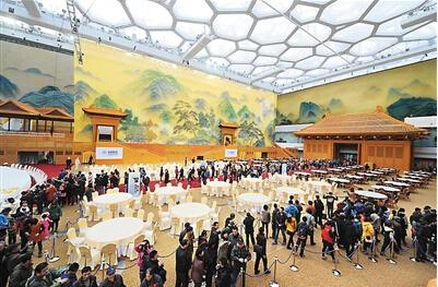 11月22日,國家游泳中心水立方啟動“上善若水APEC之旅”,重新向社會開放。作為APEC晚宴所在地,游客在水立方可以一覽晚宴大廳,欣賞國宴餐具,品嘗國宴甜點,而票價仍舊保持30元不變。