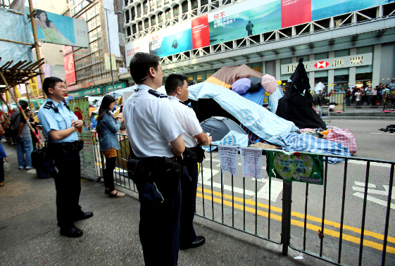 中新網11月25日電 綜合香港媒體報道,香港高等法院頒布旺角占領區的禁制令,執達主任今天(25日)抵達現場協助執行禁制令,警方呼吁在場人士盡快撤離。