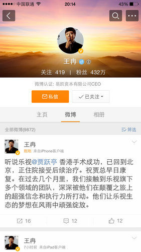 王冉微博上稱:“聽說樂視@賈躍亭 香港手術成功,已回到北京,正住院接受後續治療。祝賈總早日康復。在過去幾個月裡,我們接觸到樂視旗下多個領域的團隊,深深被他們在顛覆之旅上的超強信念和執行力所打動。他們讓樂視生態的夢想在風雨中頑強綻放。”