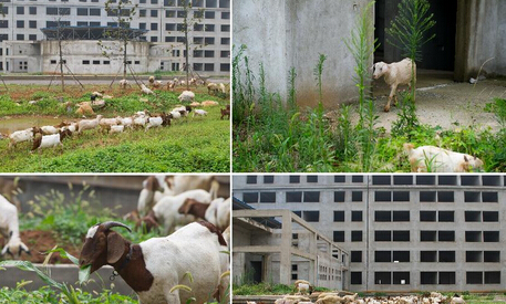 在安徽蕭縣閑置“政府辦公樓”前的雜草叢,當地居民在此放羊(7月29日攝)。
