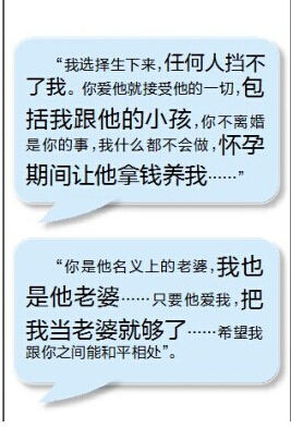 “你是他名義上的老婆,我也是他老婆......希望我和你之間能和平相處”,近日,海口一小三在懷孕逼宮讓位未果后竟理直氣壯地發短信給原配要求共侍一夫。據了解,該女子與情夫原是生意上的“合作伙伴”,后來發展成情人關系,還讓情婦懷孕了。