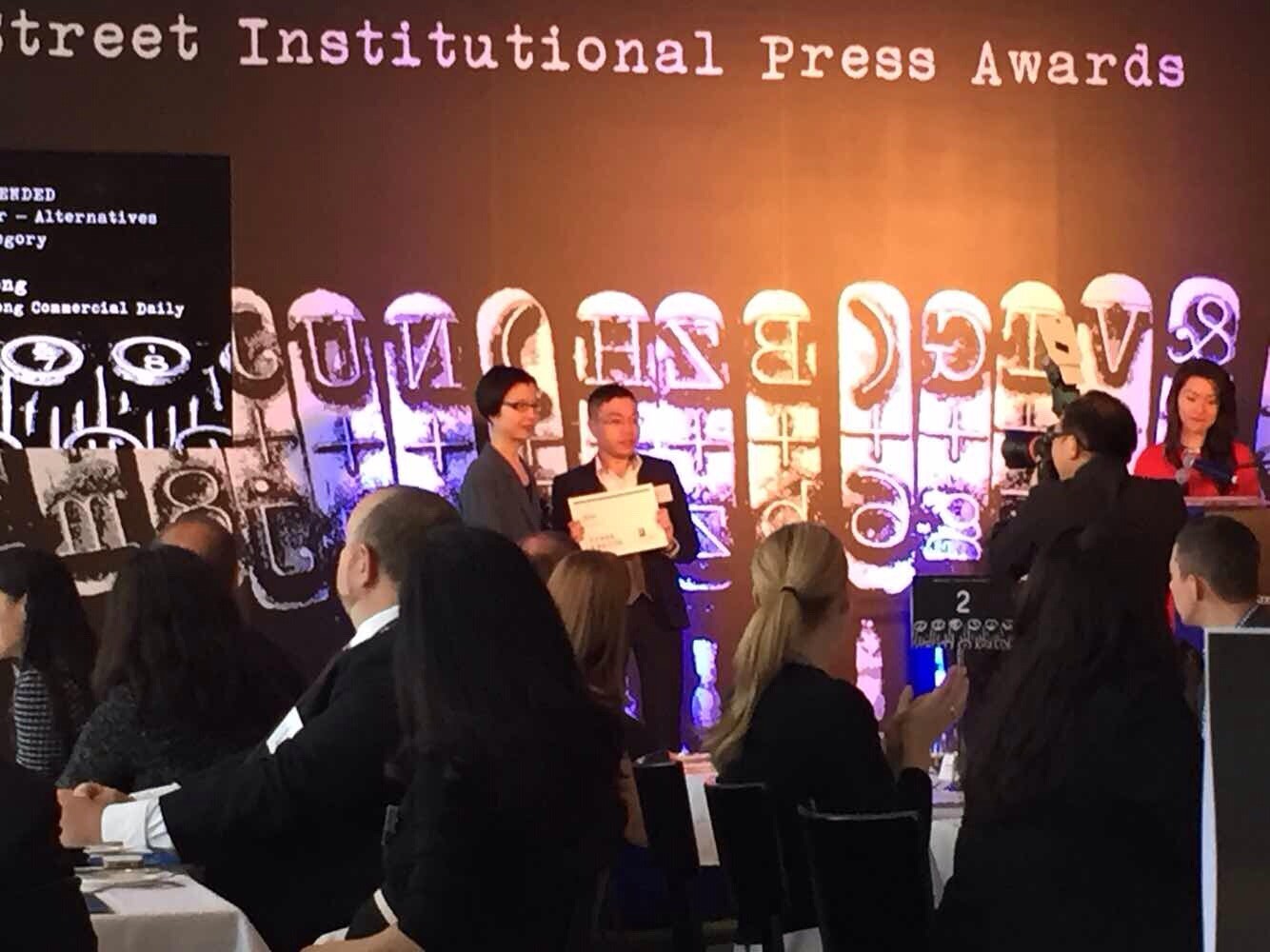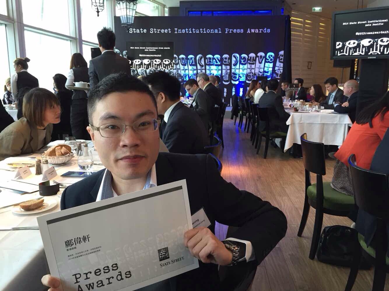 香港商報財經記者鄺偉軒於今年9月參评「2014年道富集團亞太區金融機構新聞獎」,並於今日獲得由道富集團頒發的「年度新聞工作者-另類投資組別」優異獎。